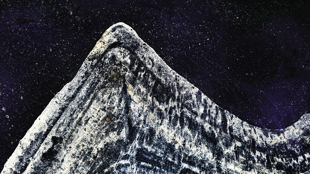 '여명의 히말라야' 하얀페인트가 묻고 얼룩이 지고 밑은 녹슨 파란색 드럼통 뚜껑의 일부. 새벽녘 햇빛이 닿는 눈 덮인 부위는 하얗게 빛나고, 아직 빛이 닿지 않은 채 우뚝 솟은 산은 눈이 푸르스름하게 보이는 히말라야 설산처럼 느껴진다.