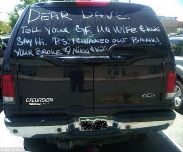 데이브는 아내로부터 ‘확실한’ 이별 통보를 받았다. 남편의 외도 사실을 안 아내는 자동차에 페인트 스프레이로 메시지를 남겼다.
