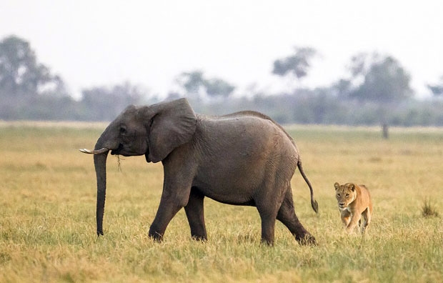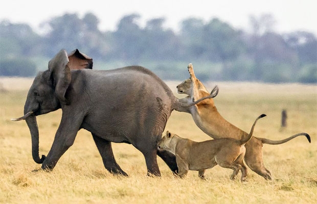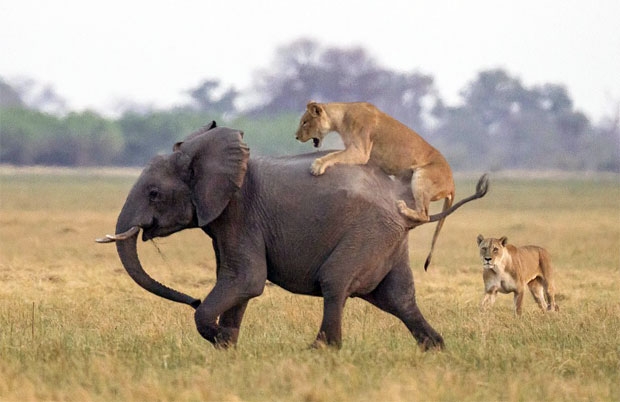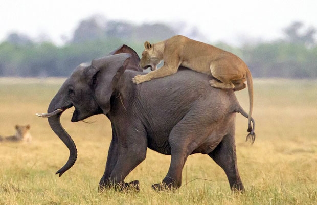 영국의 사진작가 제임스 기포드는 아프리카 보츠와나의 초베국립공원에서 코끼리 사냥에 나선 암사자를 발견했다. 기포드는 “암사자 두 마리가 코끼리 무리 뒤에 따라붙어 누군가 뒤처지기를 기다리는 듯했다. 얼마 후 새끼 한 마리가 뒤처지자 사냥을 시작했다”고 설명했다.