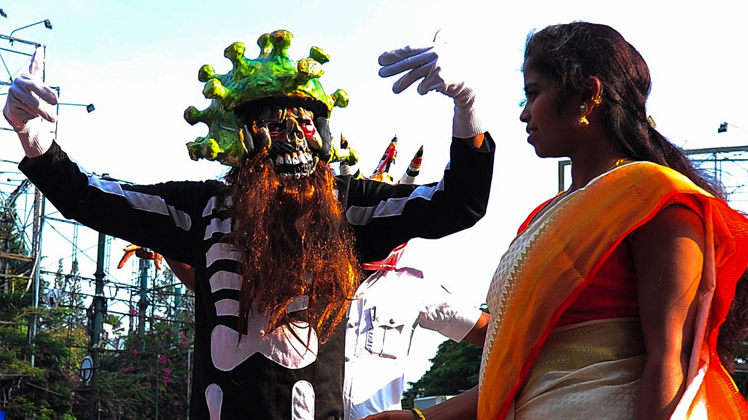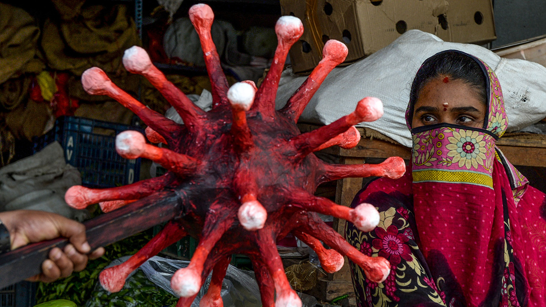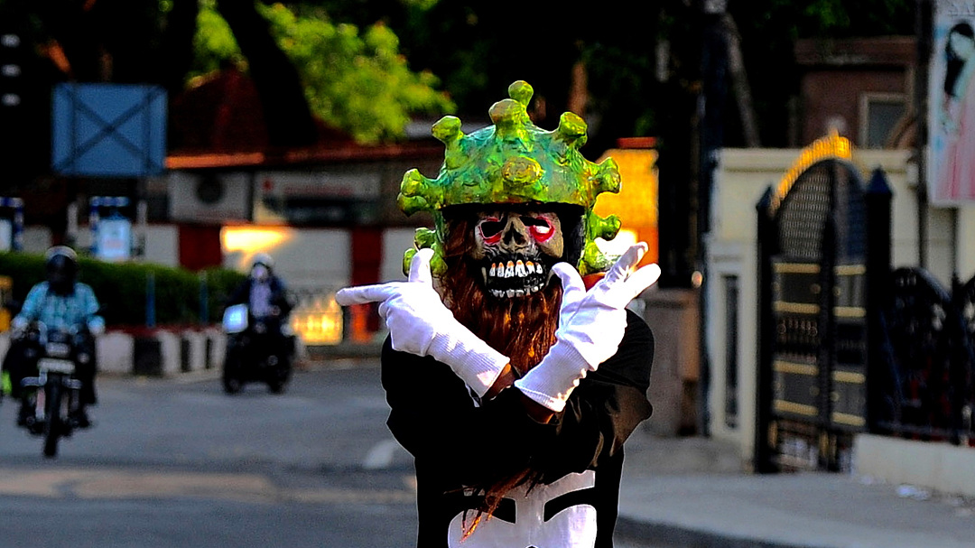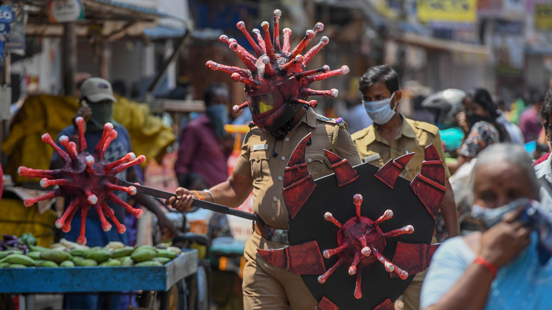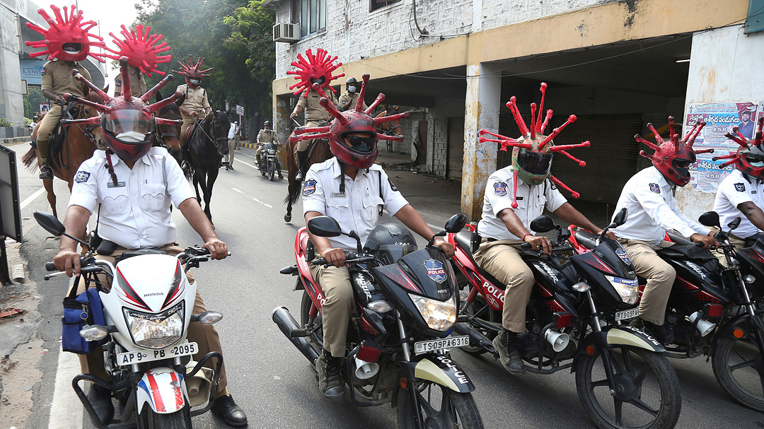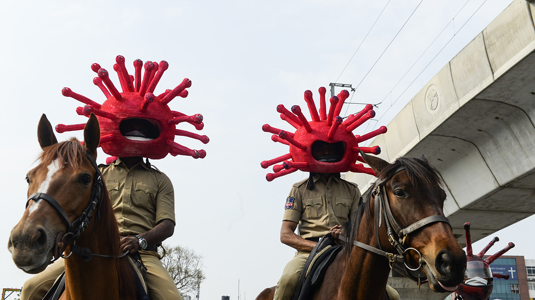 2일(현지시간) 코로나 바이러스 모양의 헬멧을 쓴 인도 경찰. 사람들에게 코로나19에 대한 경각심을 주기 위해서 착용했다./EPA연합뉴스