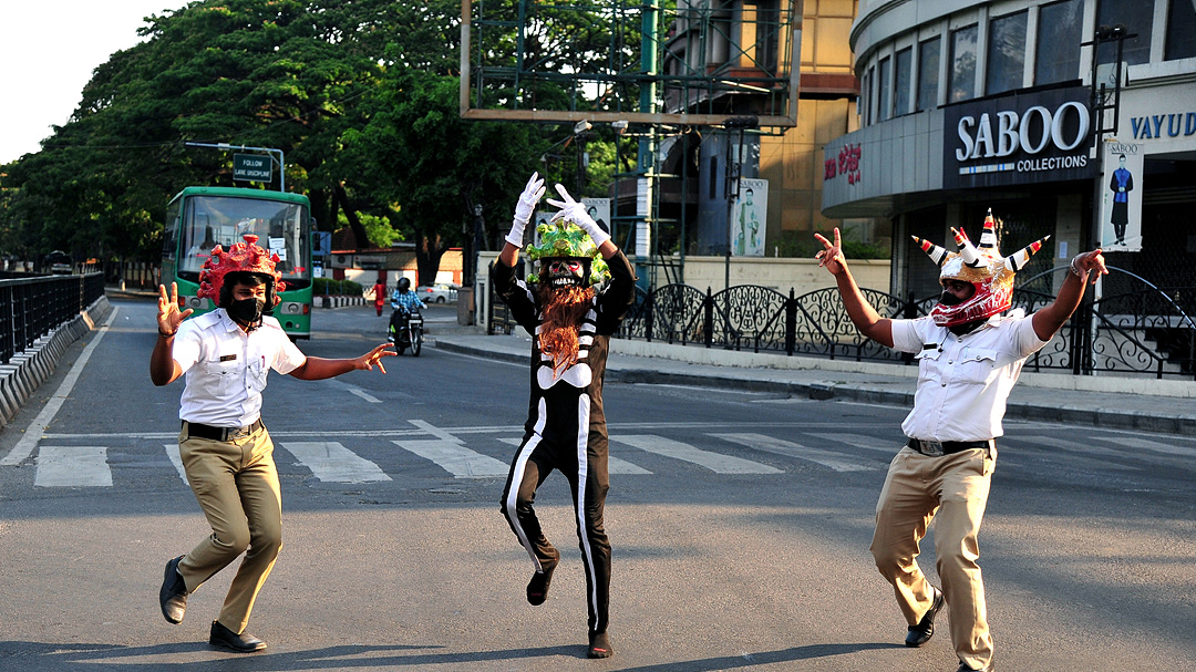 2일(현지시간) 인도 남부 지역에서는 ‘코로나 헬멧’을 쓴 경찰이 등장했다. 현지 매체는 사람들에게 코로나19에 대한 경각심을 주기 위해서라고 전했다. 첸나이 지역에서 근무하는 경찰 라제시 바부(Rajesh Babu)는 언론과의 인터뷰에서 “정부가 이동을 자제해 달라고 했지만, 여전히 사람들이 외부활동을 하고 있다”며 “심지어 마스크도 쓰지 않은 채 거리를 활보 하고 있다”고 코로나 헬멧을 쓴 이유를 설명했다./AFP연합뉴스