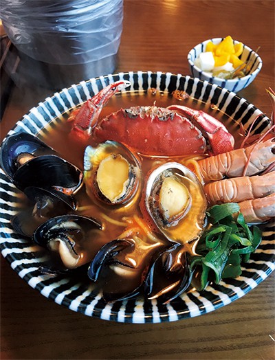 목스치킨은 제주도 표선 해수욕장 근처에 위치해 있어, 야외 테라스에서 바다를 바라보며 ‘혼밥’하기에 안성맞춤이다. 메뉴는 라면, 필라프, 리조또 단 세 가지. 먼저 ‘그대와제주라멘’(1만2000원)이 일품인데, 제주산 해산물들과 목스가 개발한 육수로 국물 맛을 냈다.