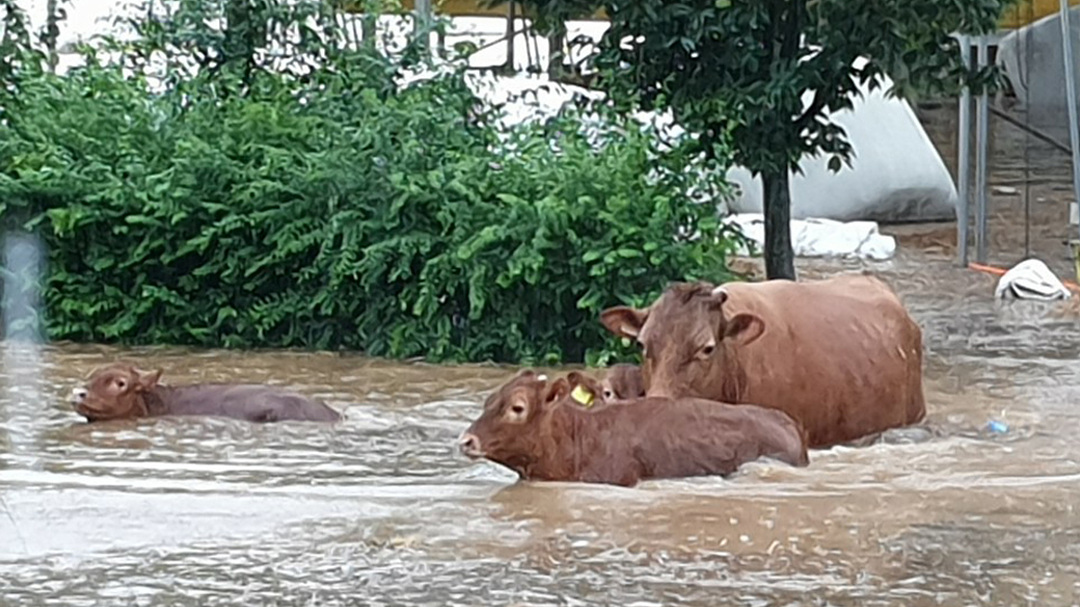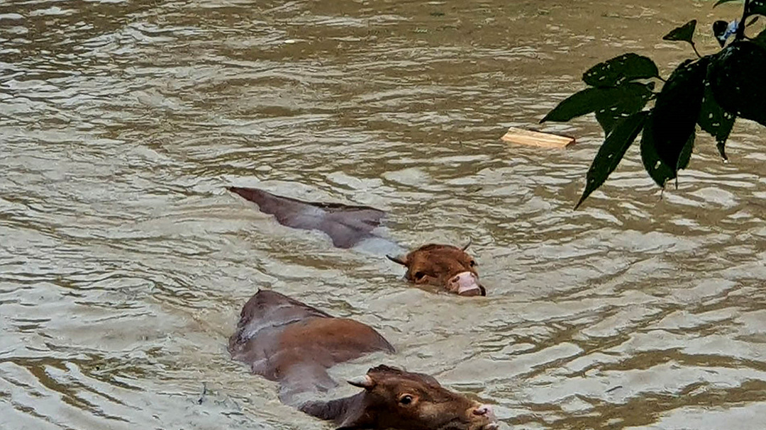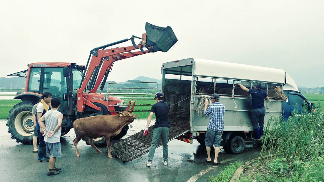 8일 내린 폭우로 전북 남원시 대강면에서 하천이 범람하면서 인근 마을 축사가 침수되자 송아지들이 탈출을 시도하고 있다. 남원에는 이날 하루 300㎜가 넘는 장대비가 내렸다./남원시