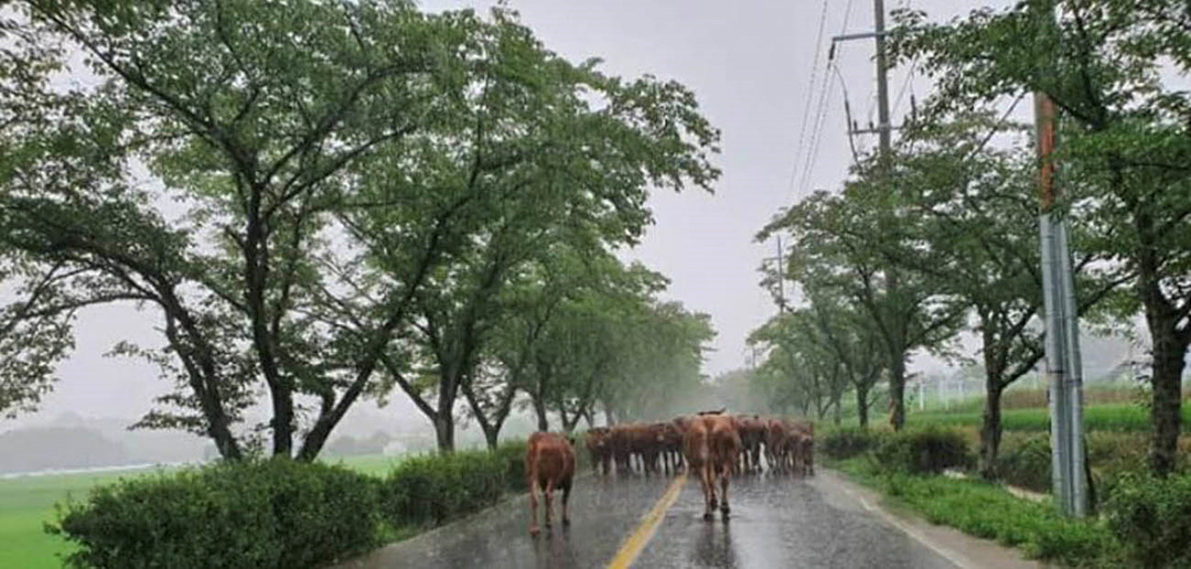 8일 전남 구례군 간전면의 한 도로에 축사를 탈출한 소떼가 이동하고 있다. 구례 지역은 이틀새 300mm가 넘는 폭우가 쏟아지면서 도로와 농경지가 침수되는 등 피해가 잇따르고 있다./연합뉴스