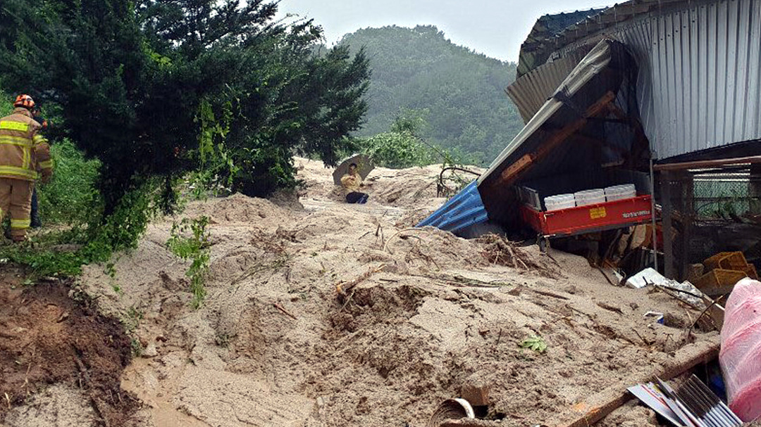 8일 오전 경남 거창군 주상면 한 야산에서 흘러내린 토사로 인해 인근 축사가 매몰되어 있다./경남소방본부