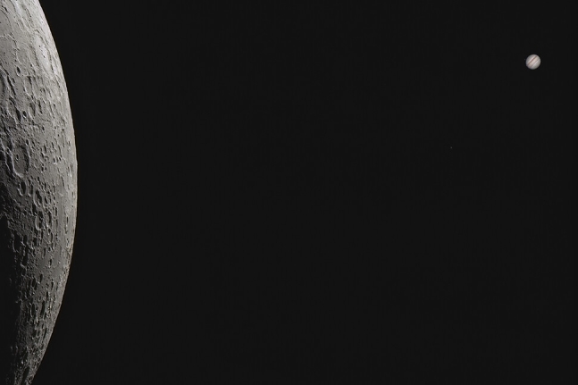행성, 혜성, 소행성 부문 수상작 ‘우주와 우리 사이’. 왼쪽이 달, 오른쪽이 목성이다. 둘 사이의 실제 거리는 7억km가 넘는다. 사회적 거리두기 시기에 `규모와 공간은 관점의 문제이기도 하다'는 점을 생각하게 해주는 사진이라는 평을 들었다. © Łukasz Sujka