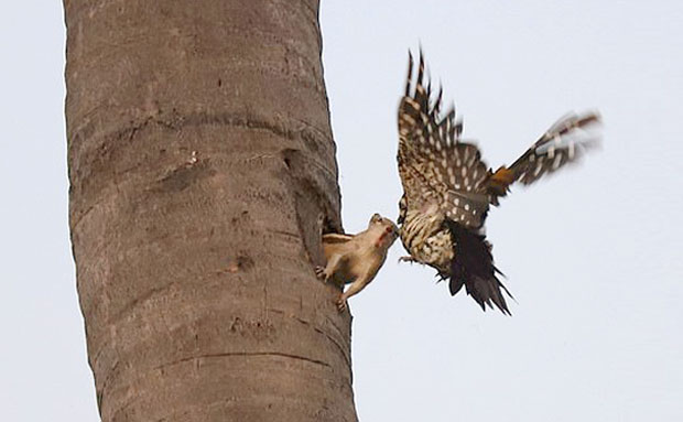 현지 주민 라비 라즈는 타밀나두주 코임바토르시 외곽에서 나무 구멍 하나를 두고 다투는 다람쥐와 딱따구리를 목격했다. 나무 구멍 안에서 튀어나온 다람쥐는 딱따구리에게 악을 쓰며 덤벼댔다. 다람쥐는 딱따구리 부리보다도 작은 발톱을 앙칼지게 세웠다. 자신보다 몸집이 작은 다람쥐에게 일방적으로 밀린 딱따구리는 결국 나무 구멍을 포기하고 달아났다.