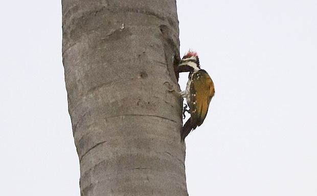 마치 불이 붙은 것처럼 등 색깔이 붉은 플레임백딱따구리(Black-rumped flameback, 학명 Dinopium benghalense)는 몸길이 28~32㎝, 무게 86~133g 정도로 비교적 덩치가 큰 딱따구리다. 하지만 몸길이 15~20㎝, 무게 100g 정도밖에 되지 않는 인도야자다람쥐에게 무참히 깨지고 말았다.