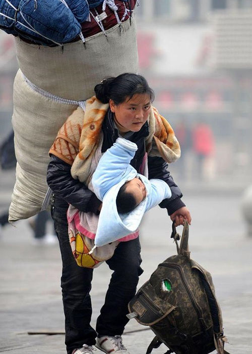 우리의 설에 해당하는 중국 최대 명절 춘제를 앞두고 한 여성이 고향에 가는 장면입니다. 어른 키만한 커다란 짐을 등에 짊어지고, 한 손에는 갓난아이를, 다른 손에는 불룩한 배낭을 땅에 끌리다시피 들고 걸어가는 사진입니다. 짐 무게에 허리는 굽어 있습니다.