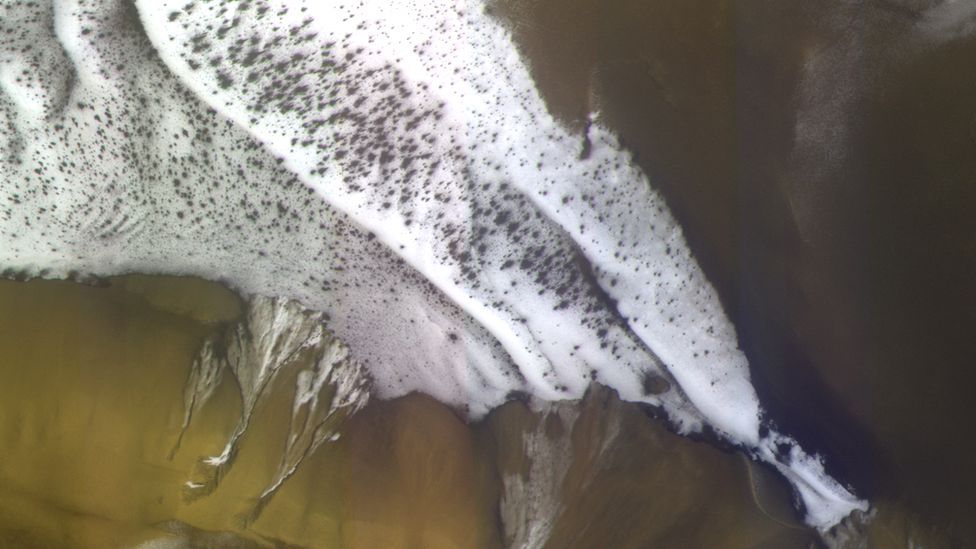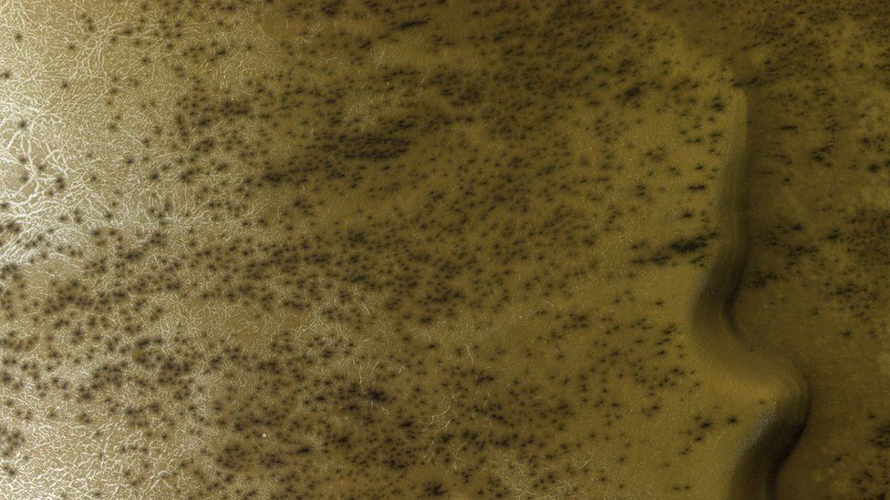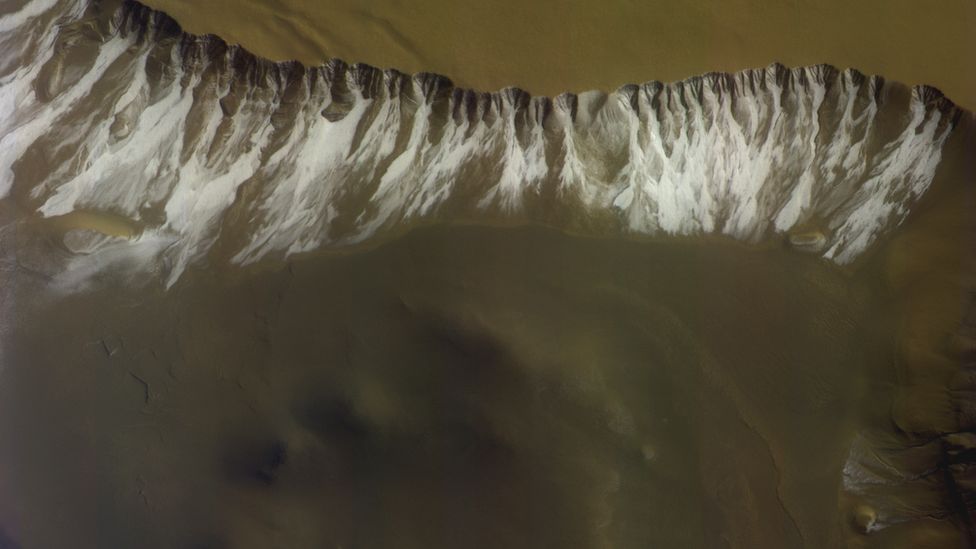 유럽 탐사선의 CaSSIS 장비로 찍은 화성 표면. 연구를 위해 다른 색을 입힌 사진이다./ESA/ROSCOSMOS/CASSIS
