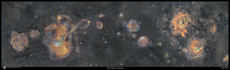 모자이크 사진 왼쪽 끝부분의 황소자리에서 페르세우스자리에 이르는 우주 영역. © J-P Metsavainio ※ 이미지를 누르면 크게 볼 수 있습니다.