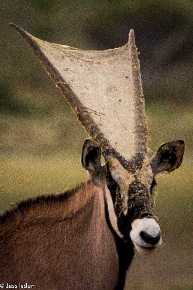 영국 옥스퍼드대 야생동물보존연구소의 제스 이스덴(39) 박사는 지난해 보츠와나에 있는 중앙칼라하리수렵금지구역을 방문했을 때 촬영한 영양 사진을 SNS상에 공유했다. 사진 속 영양의 두 뿔 사이에는 거미줄이 촘촘하게 얽혀있는 모습이다.