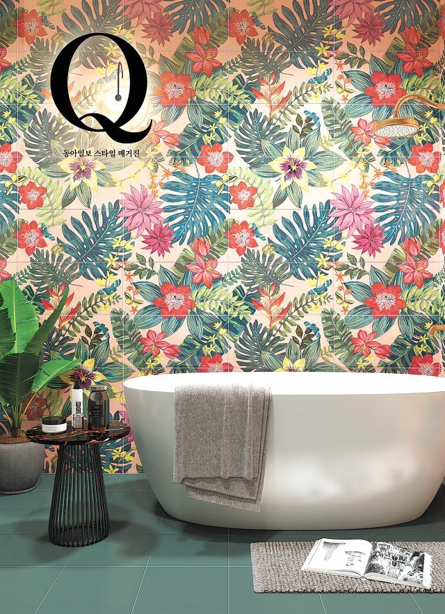 유니크 시리즈는 꽃무늬 타일뿐 아니라 웨인스코팅(실내 벽에 사각 프레임 형태로 장식 몰딩을 붙이는 것) 타입의 짙은 녹색 타일도 함께 배치해 고급스러운 느낌을 한층 더 살렸다. 여기에 미국 브랜드 콜러의 메모아 시리즈 도기와 로즈 골드 색상의 캘스톤 시리즈 수전은 클래식하고 럭셔리한 느낌을 강조한다. 우아한 곡선 디자인이 돋보이는 독립형 욕조는 프리미엄의 분위기를 더했다.