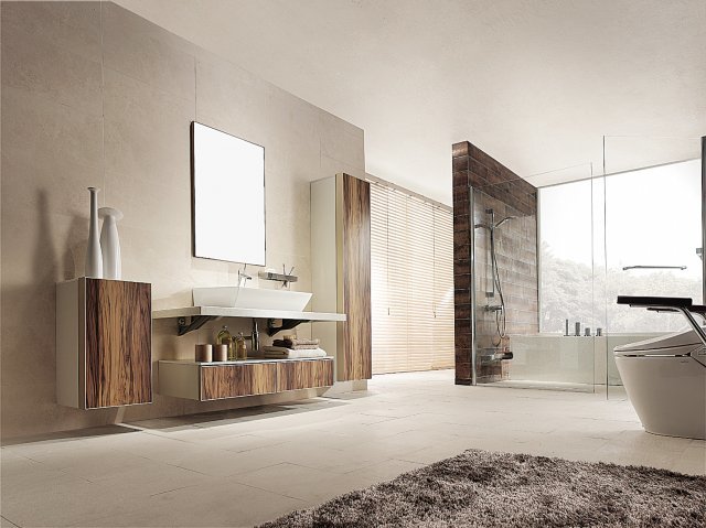내추럴 바움’은 건식 욕실로, 북유럽의 휴양지에 있는 듯한 느낌을 준다. 살아있는 나무 질감과 베이지 컬러가 자연의 고급스러움을 살린다. 방수 소재로 된 욕실 가구는 물이 닿는 공간과 수납이 분리되도록 설계됐다. 세면대 하부에는 인조대리석을 배치해 모던한 디자인을 연출했고, 그 아래 위치한 서랍장은 나뭇결을 그대로 살려 자연의 이미지를 강조했다.