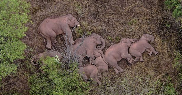 사진을 보는 순간 빨려들어갔다. 드론이 잡아낸 2021년 최고의 장면 같았다. 지난 6월 7일 전세계 미디어를 통해 알려진 코끼리 가족의 잠자는 모습이다. 중국 운남성에서 15마리의 코끼리 가족이 서식지를 떠나 500㎞를 이동 중이라는데, 이들이 잠자는 모습에선 여행의 고단함이 느껴지지 않는다.