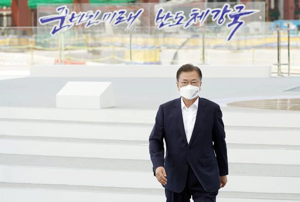 문재인 대통령이 지난 5월 13일 오후 경기 평택시 삼성전자 평택단지 3라인 건설현장에 마련된 야외무대에서 열린 'K-반도체 전략 보고‘에 참석해 모두발언 후 자리로 향하고 있다. /뉴시스