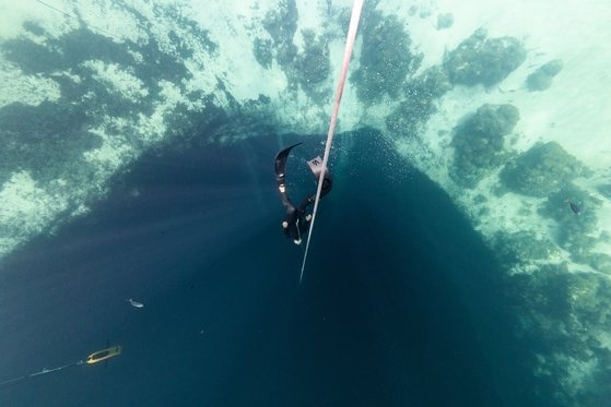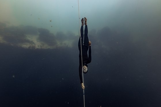 숨을 고르고, 머릿속을 가다듬는다. 그렇게 5분. 그리고 한 번의 호흡. 김정아 선수가 바닷속으로 들어간다. 김 선수가 잠수한 바하마의 ‘딘스블루홀’은 수심 202m. 그 절반 가까운 86m를 3분25초에 왕복했다. 무호흡 잠수, 이 스포츠를 프리다이빙이라고 부른다.