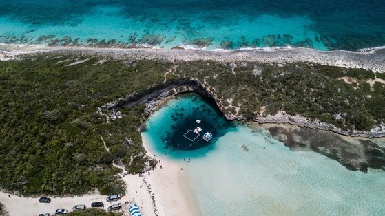 프리다이빙 대회의 윔블던 격인 2021년 '버티컬 블루'가 열린 바하마의 딘스블루홀은 깊이가 202m에 이른다. [사진 Alex St. Jean]