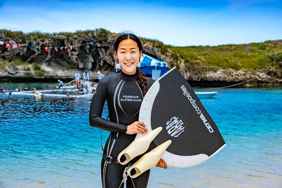 프리다이빙 대회의 윔블던 격인 2021년 '버티컬 블루'가 열린 바하마의 딘스블루홀 앞에서 김정아 선수가 가 모노핀을 들고 있다. 모노핀을 착용하고 벌인 CWT 종목에서 김 선수는 85m까지 잠수했다. [사진 Go Hayakata]