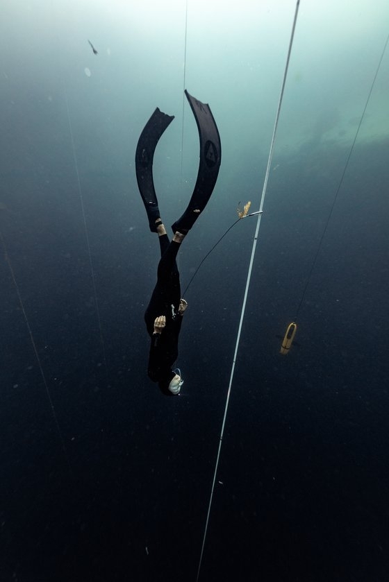 프리다이빙 대회의 윔블던 격인 2021년 '버티컬 블루' 대회가 열린 바하마의 딘스블루홀에서 김정아 선수가 잠수하고 있다. 김 선수는 이렇게 바이핀을 신고 벌인 CWTB 종목에서 86m 잠수로 아시아 신기록을 세웠다. [사진 Daan Verhoeven]