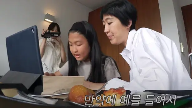 유튜브 '공부왕찐천재 홍진경'에서 홍진경이 딸 라엘을 직접 가르치는 모습.