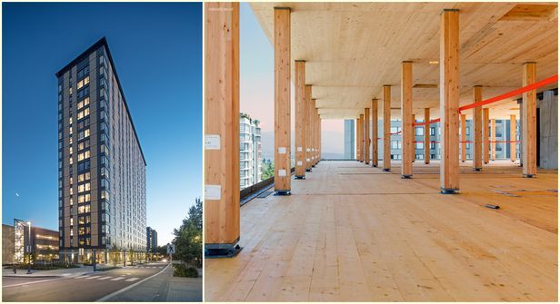 목조건축의 고층화를 알리는 신호탄이었다. 콘크리트로 만든 엘리베이터실과 계단실을 제외하고 기둥과 벽 그리고 바닥을 모두 나무로 만들었다. 콘크리트와 나무를 결합한 하이브리드(혼합식) 구조다. 높이 53m라는 규모만으로도 세계 건축계의 관심을 받았지만, 더욱 놀라웠던 것은 9주 만에 단 9명의 인력으로 18층 구조를 세웠다는 점이다.