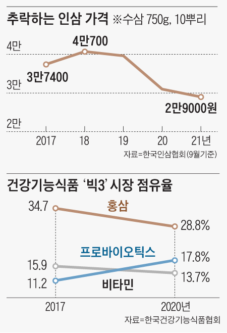 2000년대 들어 한약 업계에선 “홍삼 때문에 한약이 안 팔린다”는 말이 돌 정도로 인삼 가공식품은 인기를 구가했다. 하지만 코로나 사태로 중국인 관광객을 비롯한 외국인 손님이 입국하지 못하는 데다, 국내에서도 프로바이오틱스(유산균) 건강기능식품이 급성장하면서 인삼 수요가 줄어든 것이다.