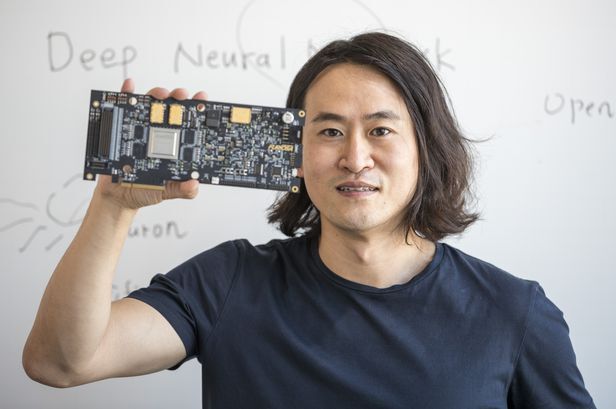 퓨리오사AI 백준호 대표가 첫 국산 범용 AI반도체 '워보이'를 들어 보이고 있다. 백 대표는 서울대 전자공학과, 미국 조지아공대를 나와 미국 반도체 설계회사 AMD, 삼성전자에서 반도체 엔지니어로 일하다 2017년 창업했다. 워보이는 성능테스트에서 세계 굴지의 팹리스(반도체 설계회사) 미국 엔비디아의 경쟁 제품(T4)보다 뛰어나다는 평가를 받았다. /김지호 기자