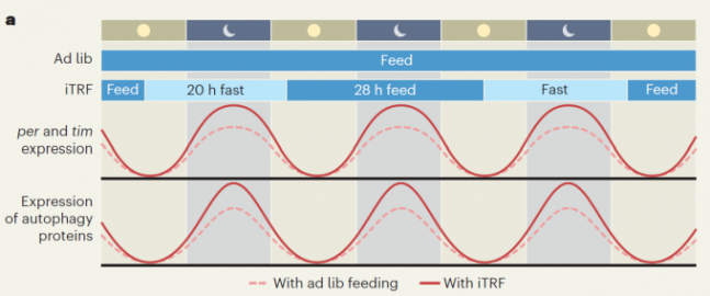 정오에서 이튿날 오전 8시까지 20시간 굶고(20h fast) 그 뒤 28시간은 아무 때나 먹을 수 있는(28h feed) 48시간 주기의 간헐적 단식(iTRF)을 하면 생체시계 유전자인 per와 tim의 발현 주기 진폭이 아무 때나 먹을 수 있는 조건(ad lib. 점선)에 비해 커지면서(실선) 자가포식 단백질(autophagy proteins)의 발현 주기 진폭도 커진다. 그 결과 밤에 자가포식이 더 활발하게 일어나 건강증진과 수명연장 효과가 나타난다. 네이처 제공