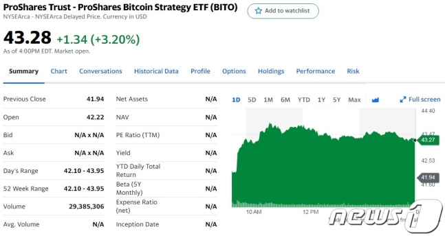 미국의 자산 관리업체 프로셰어가 전일 출시한 비트코인 ETF는 20일(현지시간) 미국 뉴욕증권거래소(NYSE)에서 3.2% 급등했다. 비트코인 ETF는 전일에도 5% 급등했었다.