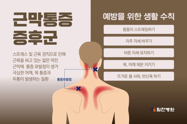 근막통증증후군은 한 자세를 장시간 유지하거나 스트레스를 받으면 근육 내 ATP라는 에너지원이 고갈되거나 운동 신경이 근섬유로 이어지는 종판에 손상이 생겨 나타나게 된다. 이런 상태가 지속되면 근육이 수축돼 단단한 띠처럼 굳는다. 근막통증증후군은 목부터 어깨, 등까지 이어지는 승모근에 주로 생기는데 수축된 근육이 목 뒤쪽으로 이어지면서 뒷목이 당기면서 두통도 발생한다. 하지만 이런 통증유발점은 MRI나 CT로는 발견할 수 없고 뚜렷한 신경학적 이상 증상도 없어 진단이 쉽지 않다.