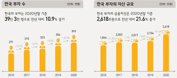 한편 지난해 말 기준 우리나라 부자 수는 39만3000명으로, 전년 대비 10.9% 늘었다. 이들이 보유한 총 금융자산은 전년보다 21.6% 늘어난 2618조원으로 나타났다. 코로나 이후 증시 활황이 부자들의 자산 증식에 영향을 미쳤다는 분석이다.