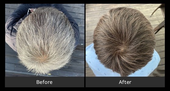 흰머리의 60대 남성이 모다모다 샴푸를 사용히기 전(왼쪽)과 8주 뒤의 모습, 갈변현상 때문에 머리카락이 흑갈색으로 변했다. [사진 모다모다]