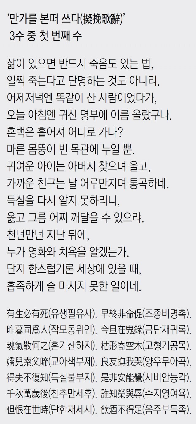 시인도 죽음 앞에 모든 성취와 영예가 무의미함을 이야기하면서도 넌지시 생전의 아쉬움을 드러낸다. 충분히 술 마시지 못한 것만 한스럽다는 말은 삶과 죽음을 달관한 유머이기도 하지만, 시인 스스로 거리를 둔 세상의 문제 역시 시사한다. 자신의 삶에 대한 불만도 담고 있다.