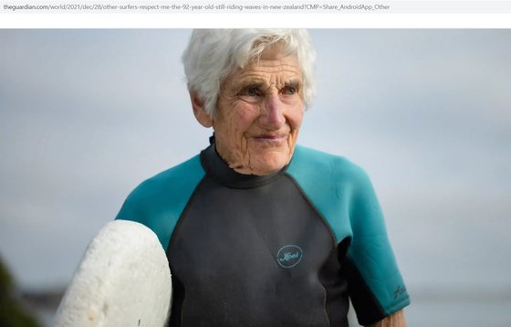 세 밤 더 자고 나면 누구나 한 살 더 먹는다. 뉴질랜드 서부 스카버로우 해변가에 사는 92세 할머니 낸시 메언 역시 마찬가지. 그러나 낸시 할머니는 새해가 두렵지 않다. 외려 기대가 크다. 새해엔 그의 소원인 서핑 점프 동작에 성공할 수 있을 것만 같은 예감 때문이다.