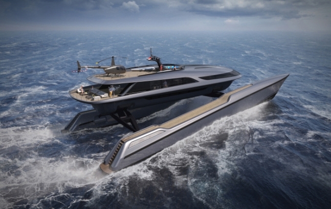 최근 미국과 영국 기업이 개발한 요트 ‘마티니 6.0’이 항해하는 상상도. 객실을 이루는 선체 아래에 파도의 움직임을 부드럽게 흡수하는 선체 2대가 따로 달렸다. 덩치가 좀 더 큰 요트인 ‘마티니 7.0’도 유사한 기술로 항해한다. 서보요트·셔틀워스 디자인 제공
