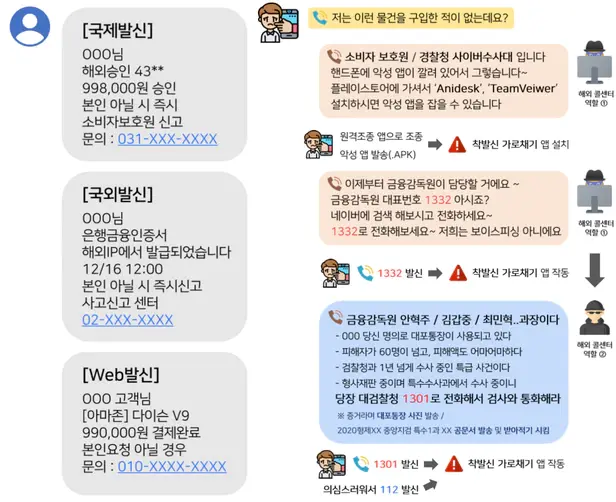 이들은 피해자가 ‘당신 명의로 대포통장이 사용되는 등 범죄에 연루됐다’라거나 ‘기존 대출을 상환해야 새 대출이 나온다’는 등의 말로 돈을 요구하기 시작한다. 이 과정에서 경찰·검찰·금감원·은행 등 각종 검증 시도가 속속 차단되면서, 피해자들은 쉽게 속아 넘어가게 된다. “협조만 잘하면 구속 없이 전화로 수사하겠다”, “가족들도 다 구속될 수 있다”, “금감원에서 제재가 들어간다” 등의 겁박 멘트까지 더해지면 피해자들은 더욱 수세에 몰리게 된다.