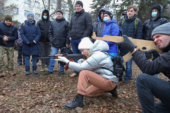 러시아의 침공 위기가 높아지면서 우크라이나 국민이 자기 고장을 지키겠다며 군사 훈련을 받고 있다. 총기가 모자라 나무총을 들고 있는 모습도 보인다. 로이터=연합