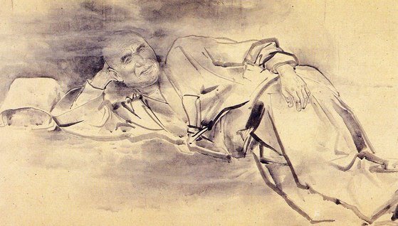 김호석 씨가 그린 성철 스님의 모습. 방에 누워서 한가롭게 휴식을 취하고 있다.