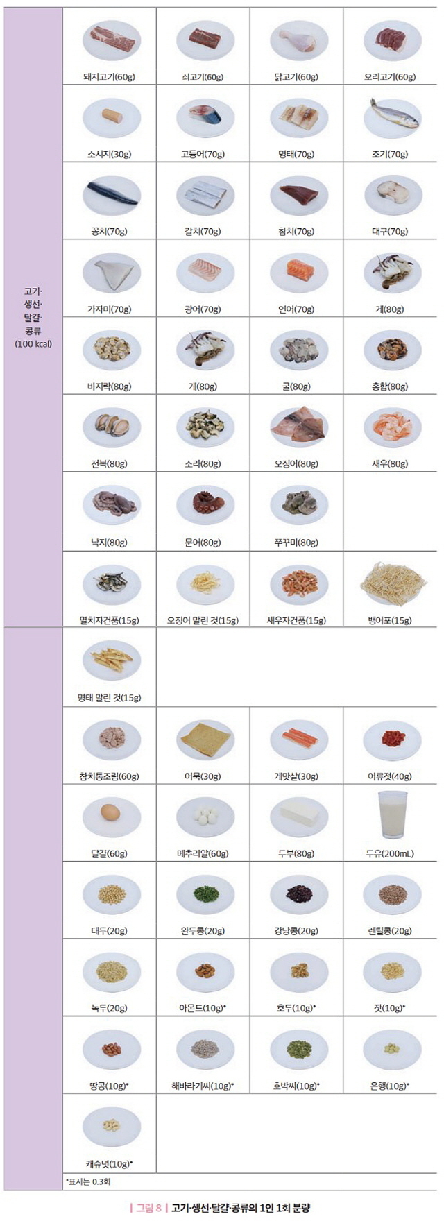 먼저 고기·생선·달걀·콩류 같은 단백질 식품은 100kcal 기준으로 1회 분량으로 나눈다.<위의 표> 이를 아침·점심·저녁에 걸쳐 총 4회를 먹으면 된다. 아침 1회, 점심·저녁 각각 1.5회씩 먹는 식이다.