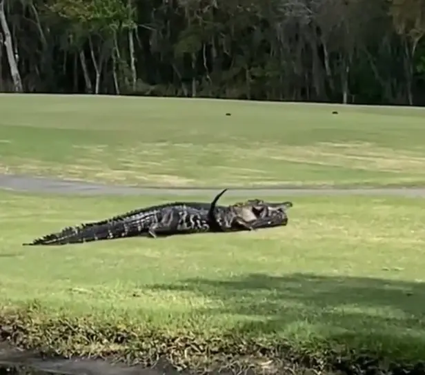 플로리다 레이크랜드의 한 골프장에서 거대한 악어가 자신보다 몸집이 작은 악어를 입에 물고 유유히 걸어가는 모습이 동영상에 포착됐다. 이 동영상은 16일부터 인터넷과 현지 언론을 통해 확산되면서 큰 화제를 모으고 있다. 악어는 종종 동족을 포식하는 모습이 발견된다. /Julie Marchillo Smith. instagram
