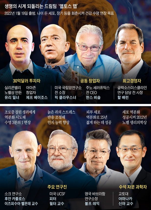 엘토스 랩은 항노화 드림팀으로 불린다. 투자자나 연구자 모두 세계적 인물들이다. 세계 최고 부자인 아마존 창업자 제프 베이조스와 실리콘밸리 노벨상인 ‘브레이크스루상’을 만든 억만장자 유리 밀너가 이 회사에 30억달러(약 3조6100억원)를 투자하기로 했다.