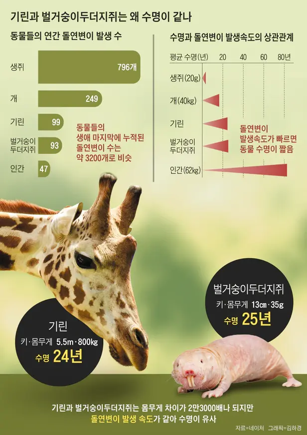 이는 기린과 벌거숭이두더지쥐에게서 잘 나타난다. 땅속에 굴을 파고 사는 벌거숭이두더쥐는 몸길이가 13㎝이다. 아프리카 기린은 키가 5m를 넘는다. 둘은 몸무게 차이도 2만3000배에 이른다. 하지만 기린은 연간 돌연변이가 99개로, 벌거숭이두더지쥐의 93개와 비슷했다. 수명도 기린이 24년, 벌거숭이두더지쥐가 25년으로 거의 같다.