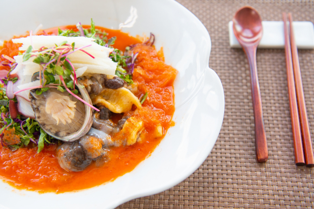 물회는 '갓 잡아 올린 생선이나 오징어를 날로 잘게 썰어서 만든 음식. 잘게 썬 재료를 파, 마늘, 고춧가루 따위의 양념으로 버무린뒤 물을 부어서 먹는 음식'으로 국어사전에 담겨 있다. 영어로는 'Cold Raw Fish Soup'. 차갑다는 단어가 포함될 정도로 시원하게 먹을 수 있는 음식으로 여겨진다.