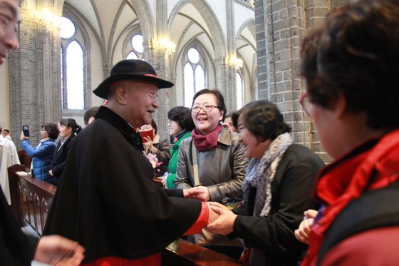 정진석 추기경이 서울 명동성당에서 신자들과 만나 인사를 나누고 있다. [중앙포토]