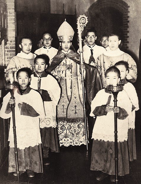 한국의 첫 주교인 노기남 대주교의 착좌식에서 복사를 맡은 어린 시절의 정진석 추기경(왼쪽 맨앞줄). [천주교 서울대교구]
