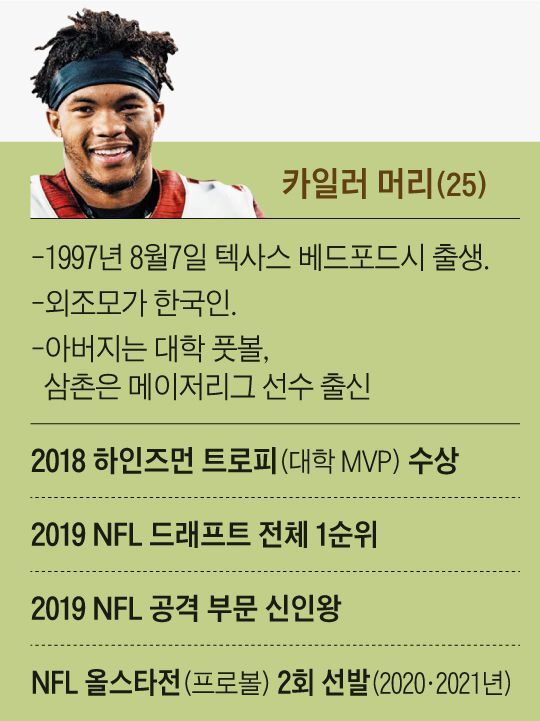 NFL(미 프로풋볼)의 한국계 쿼터백인 카일러 머리(25·애리조나 카디널스)는 29일 기자회견을 자청해 이렇게 말했다. 그는 지난주 구단과 5년간(2024~2028시즌) 최대 2억3050만 달러(약 2992억원)를 받는 조건으로 연장 계약을 맺었는데, 여기엔 특이한 추가 조항이 들어 있다.