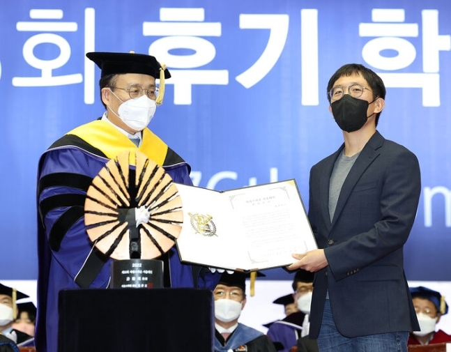 29일 서울 관악구 서울대학교에서 열린 제76회 후기 학위수여식에서 필즈상 수상자인 허준이 교수가 '자랑스러운 서울대인' 선정 증서를 오세정 서울대 총장으로부터 받은 뒤 기념촬영을 하고 있다. (사진=연합뉴스)