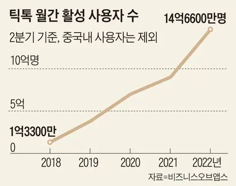 틱톡은 다른 소셜미디어가 10여 년에 걸쳐 이뤄낸 성장을 단숨에 따라잡았다. 모바일 데이터 분석 업체 비즈니스오브앱스에 따르면 2018년 2분기 틱톡 이용자 수는 1억3300만명에 불과했지만 2020년 2분기 7억명으로 급증했고, 올해 2분기에는 14억6600만명까지 늘었다. 앱 참여도를 가늠할 수 있는 이용 시간 면에선 경쟁자들을 넘어섰다.