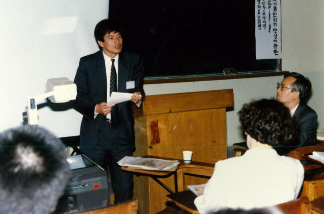 고려대 조교 시절의 젊은 염재호. 과학기술 포럼에서 강연하고 있다